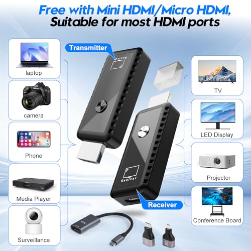 【Wide Compatibility】Hdmi transmitter and receiver provides hdmi connector and Type-C adapter for use, compatible with most HDMI devices, laptops, PCs, cameras, DVDs, digital cameras, set-top boxes, cable TVs and more. Ideal for conference rooms, home entertainment, multimedia education and outdoor entertainment, it delivers high-quality visuals with virtually zero latency on a larger screen for easy and reliable wireless streaming.