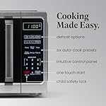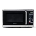 This microwave oven is the ideal size for office break rooms or home kitchens. One-touch cooking programs let you cook six of the most popular food items with the touch of a button. Choose from ten power levels up to 900. The large digital screen has a clock feature and can display a countdown timer in addition to the remaining cook time. The memory function lets you customize and save your favorite settings, and the large door has an easy-grip handle and child-safety lock.