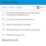 HP Envy 6155e Wireless All-in-One Color Inkjet Printer, Print, scan, Copy, Duplex Printing Best-for-Home, 3 months of Instant Ink included (714L5A)